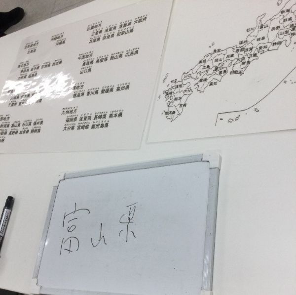 後半のレクは、「ヒントで県名あてクイズ」です。各都道府県の名所や名産品などヒントを出していき、県名を当てていただきます。少ないヒントで当たると、高得点がもらえます。たいてい名所が出ると直ぐ当たるので、出題に工夫を凝らし(笑)ます。最初のヒントは、『きゅうり』とか『みかん』。候補地がいくつかあって迷いますね。皆さん悩んでくれまして、3組別々の答えが出たりして盛り上がりました。『米』では新潟、秋田、北海道と答えが分かれていました。が次のヒント『トキ』で新潟と答えた方に軍配が。