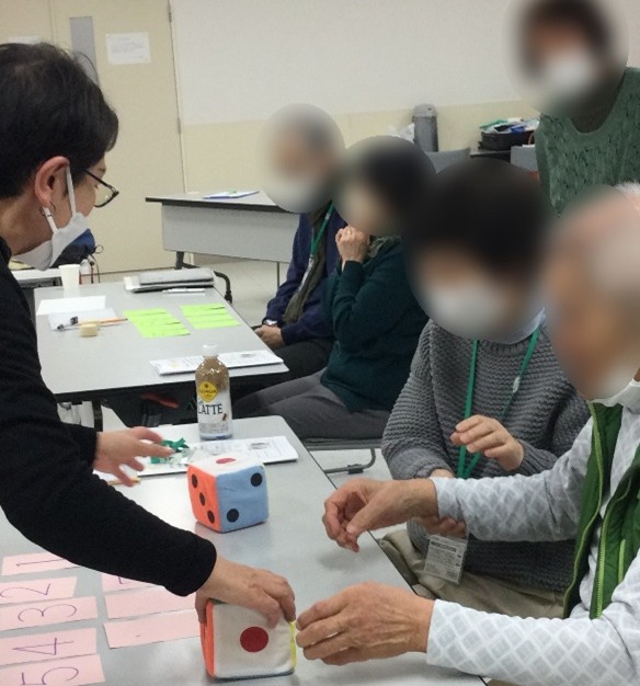 合併症の失行という症状のため、サイコロをうまく転がすことが難しい方もおられましたが、繰り返しチャレンジしていると、徐々に慣れてくる場合もあります。とにかく、このサイコロゲームはいつも盛り上がります。たまにゆるーい感じのゲームもいいですね。