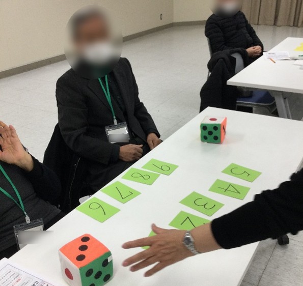 後半のレクは久しぶりの「サイコロゲーム」です。1~9までの数字のカードを皆さんにお配りし、並べていきます。ご夫婦2人もしくはお1人で、2個のサイコロを同時に転がして出た目の数の合計と同じ数になるよう、手元のカードを裏返していきます。